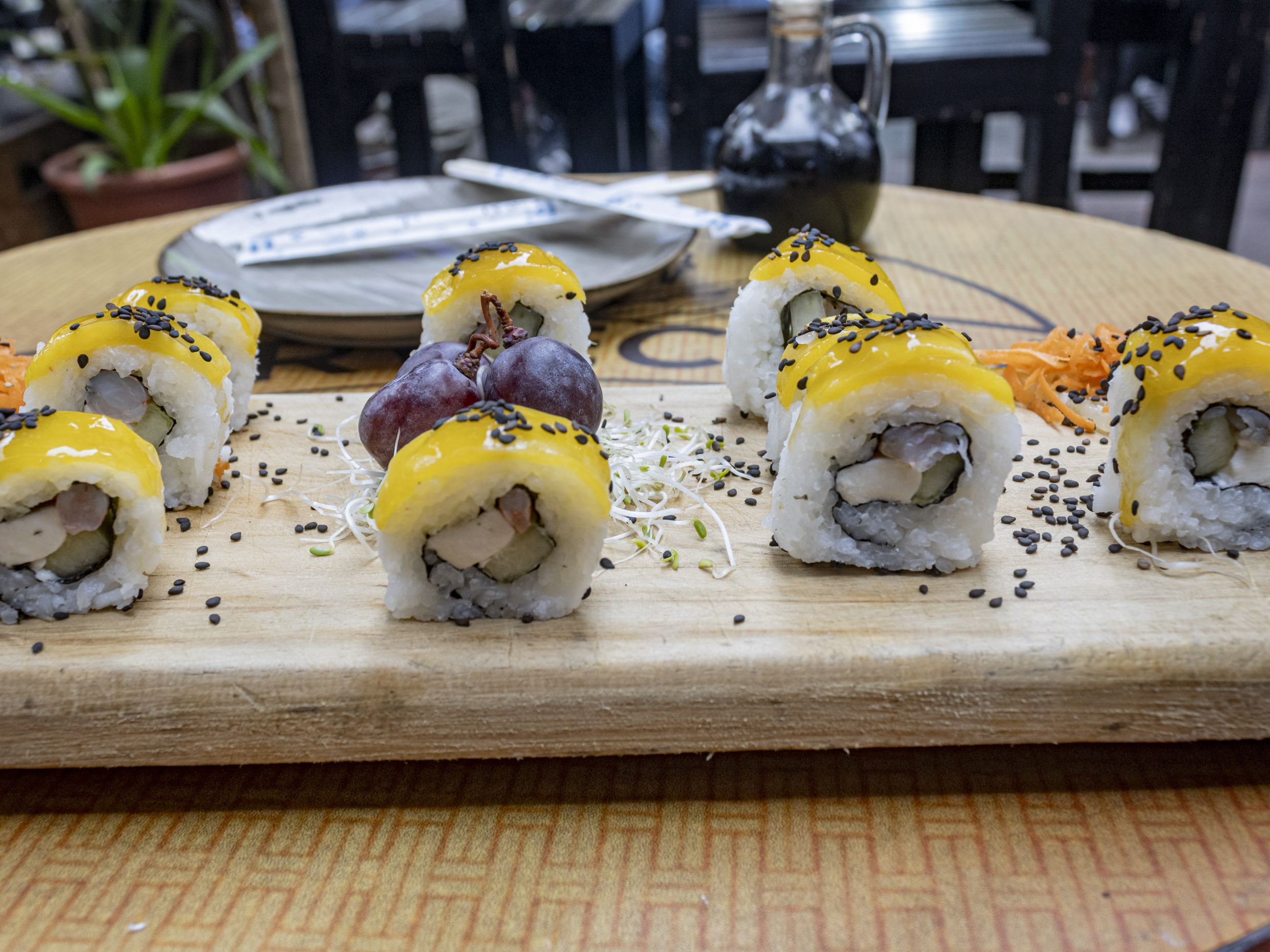 10rollos rellenos de pepino ,philadelfiia, camarón por fuera salsa de mango ( por qué no. Es temporada de mango no lleva lámina de mango