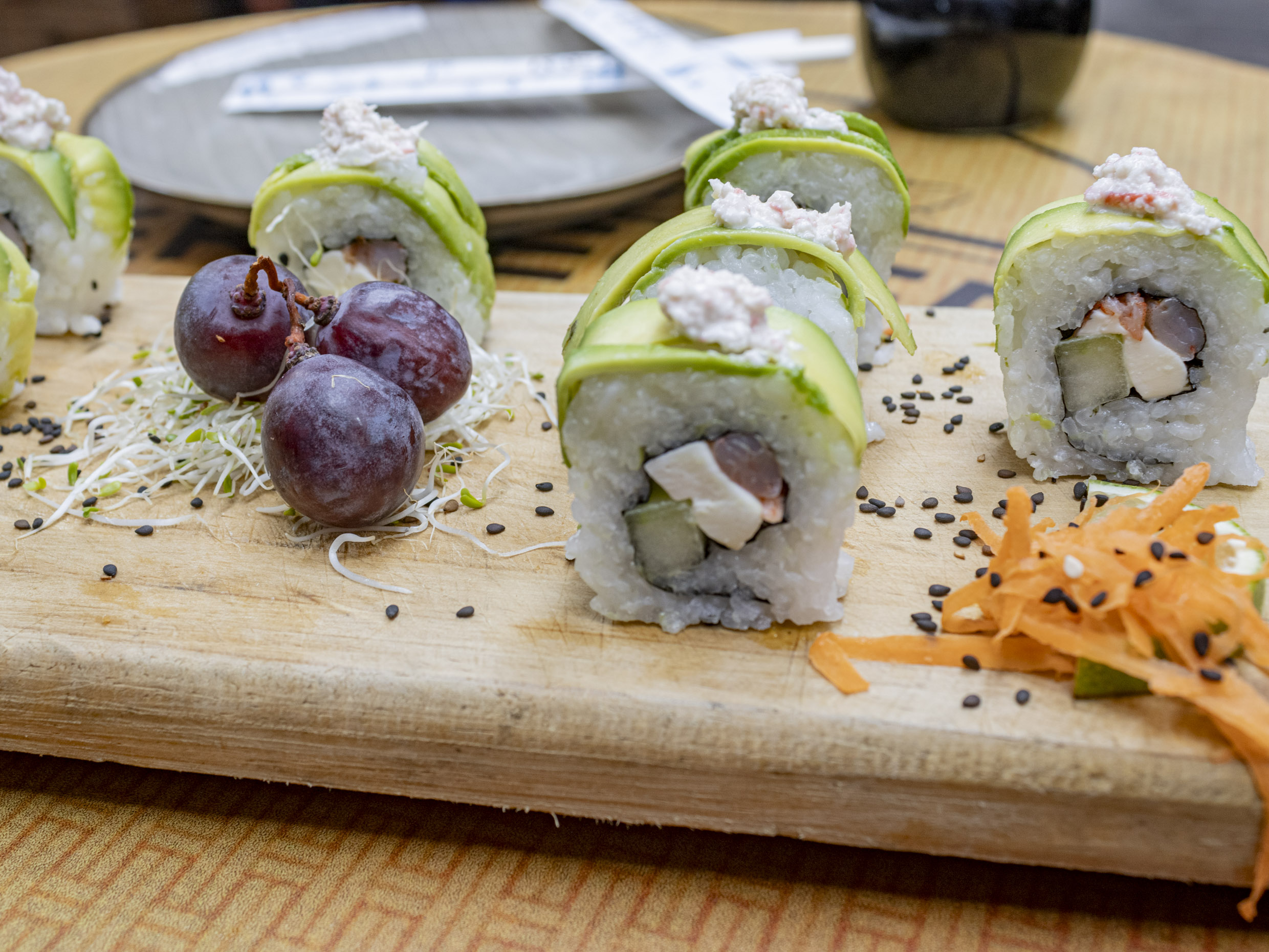 10 rollos rellenos de pepino ,aguacate y camarón por fuera ajonjolí negro