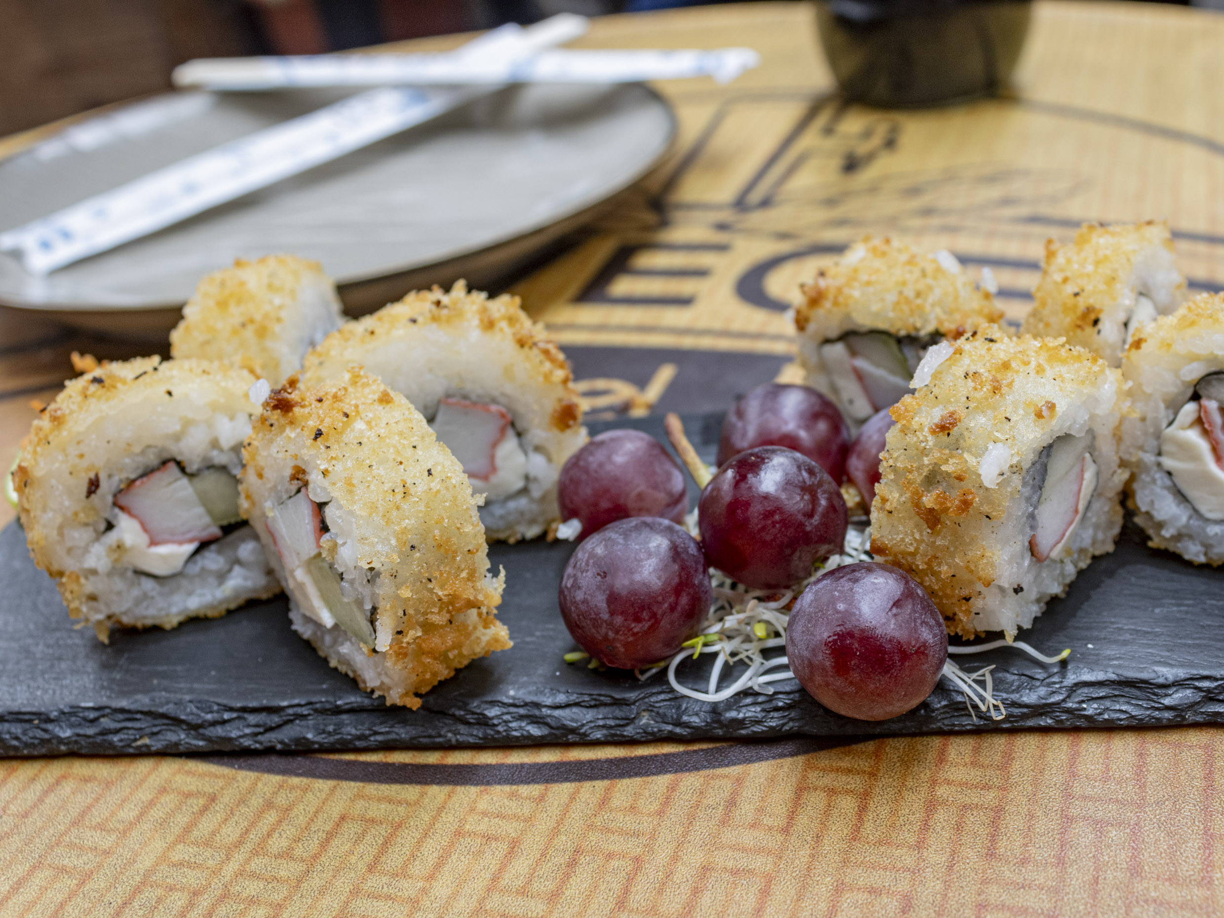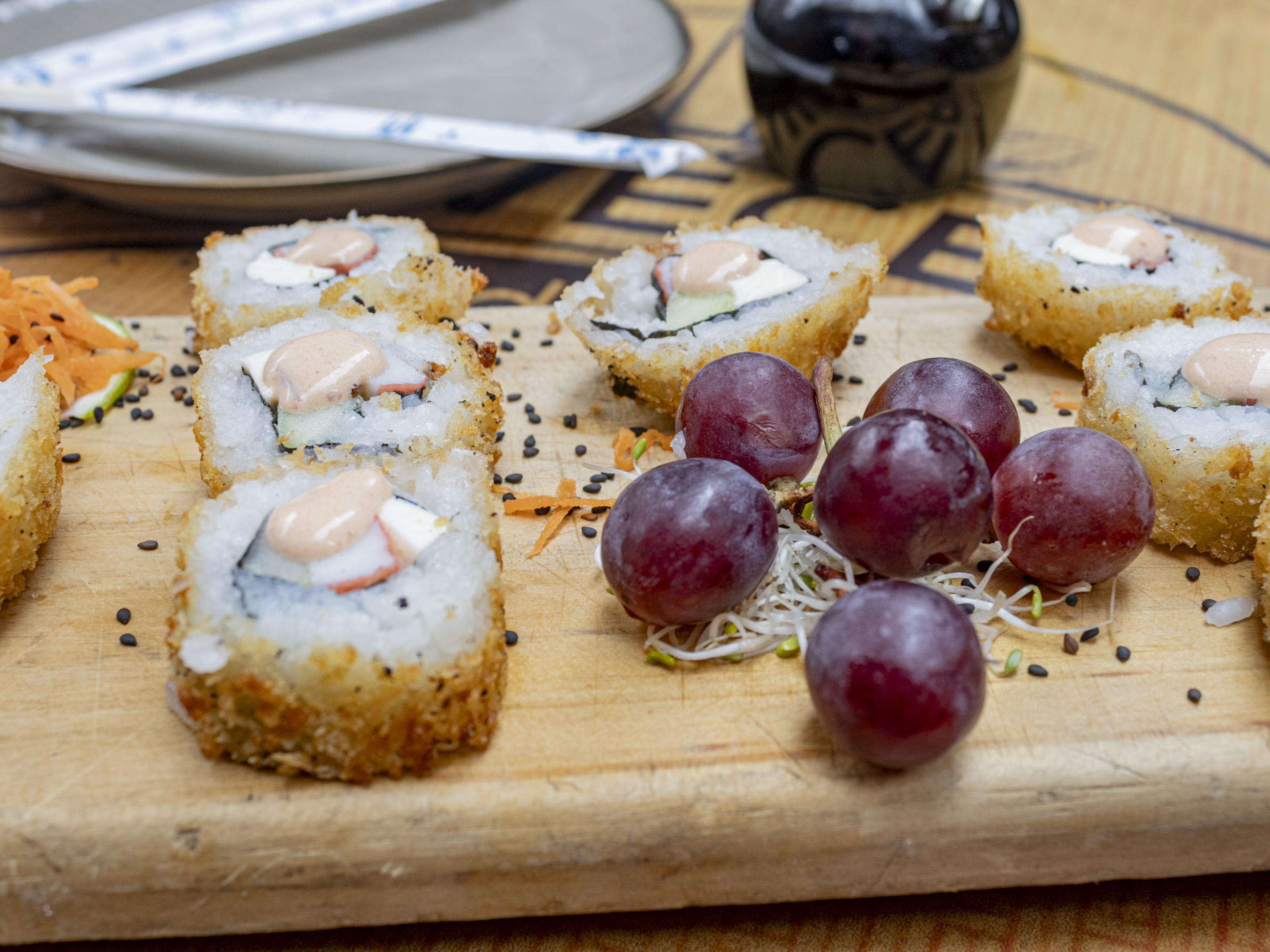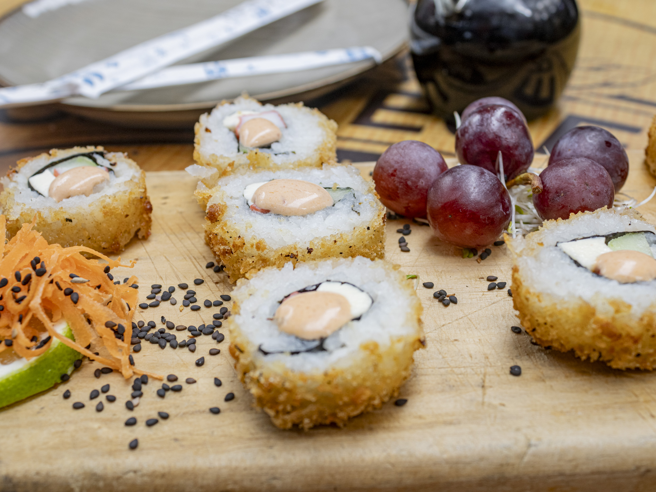 10 rollos por dentro pepino , philadelfiia ycamaron por fuera empanizado con salsa de chipotle