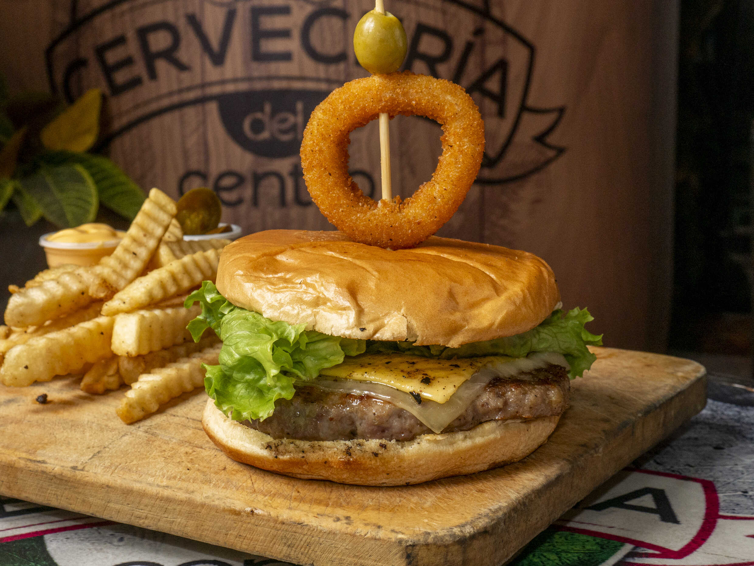 Selecta carne de res con aderezo BBQ y aros de cebolla por dentro, queso manchego, lechuga, jitomate, mayonesa y papas chip.