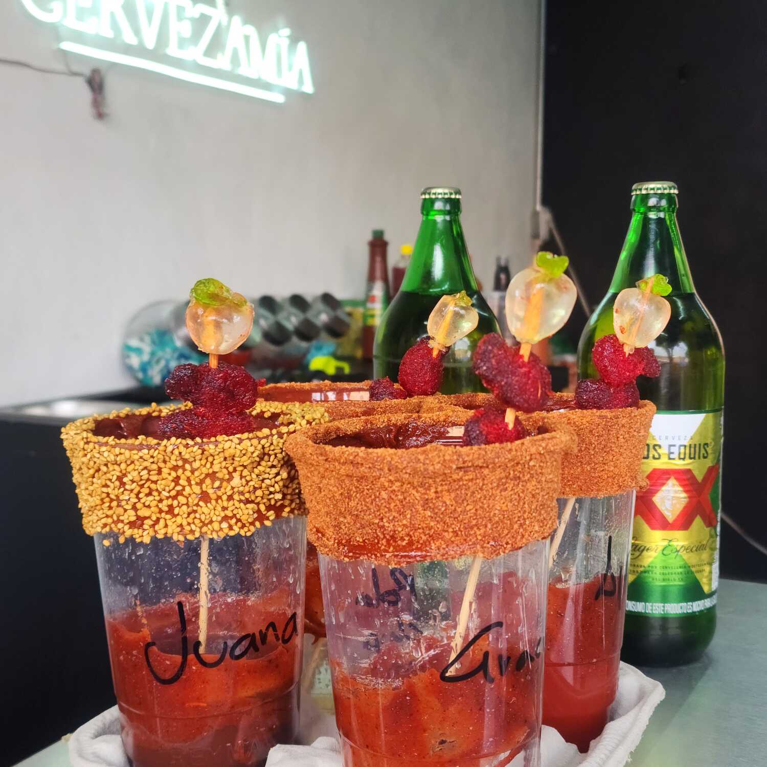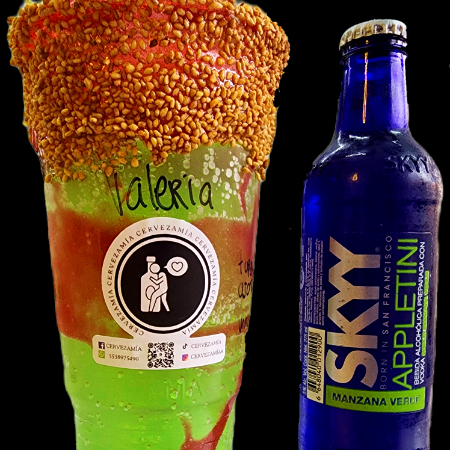 1 skyy de 355 ml, shot de absolut, saborizante de mz verde y un vaso escarchado a tu gusto