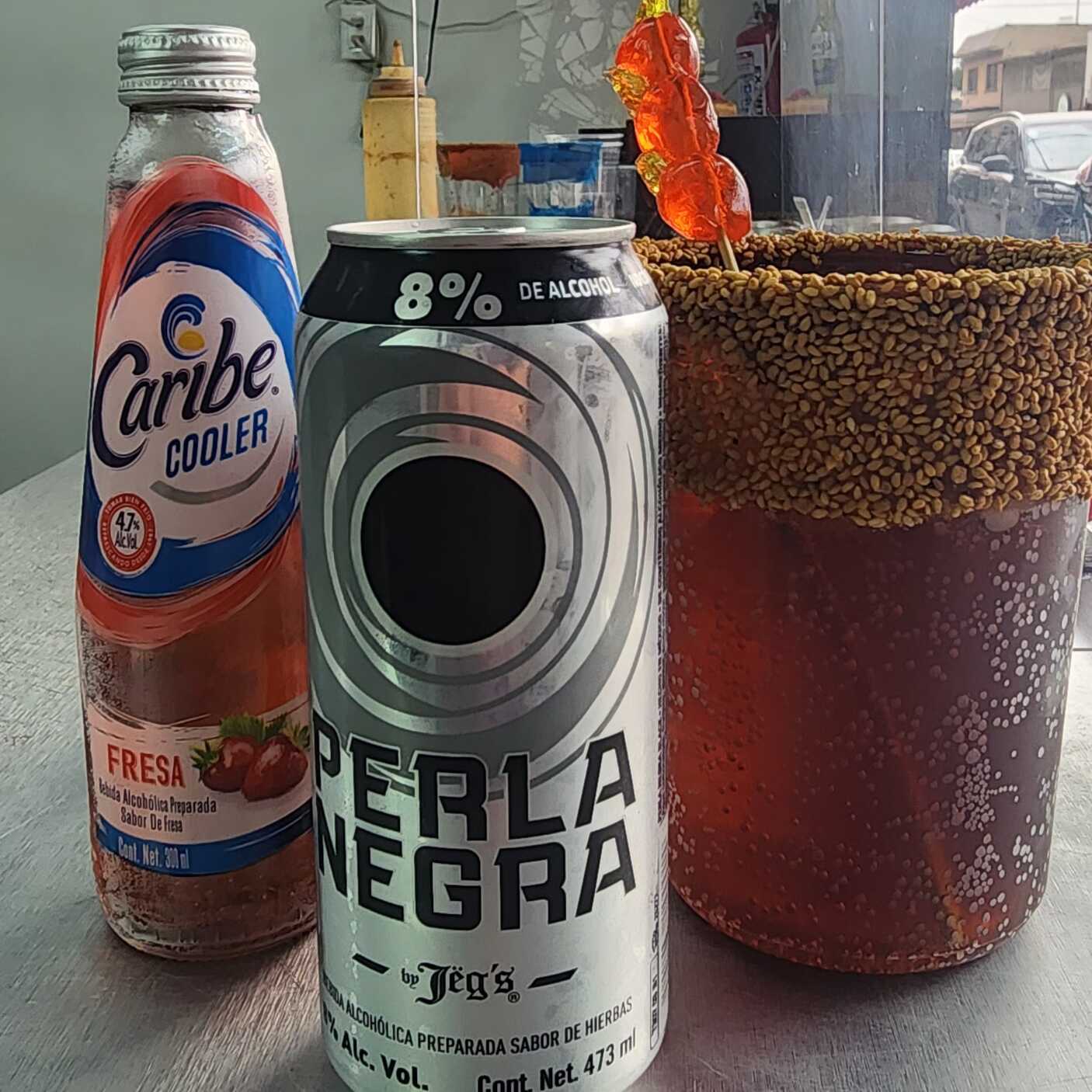 1 caribe de 300 ml, 1 lata de perla negra de 473 ml, vaso escarchado a tu gusto
