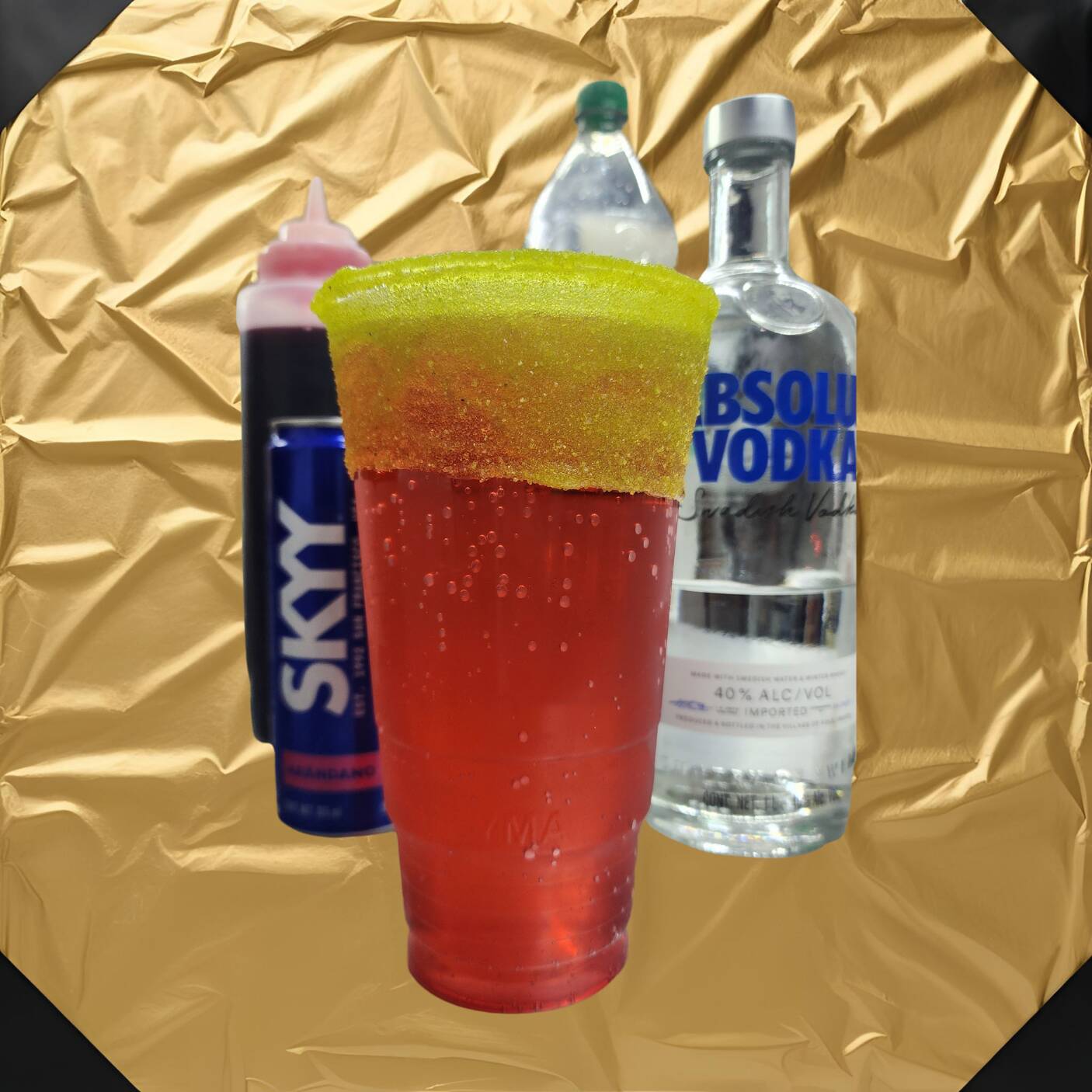 1 skyy de 355 ml, shot de absolut, saborizante de mango y un vaso escarchado a tu gusto