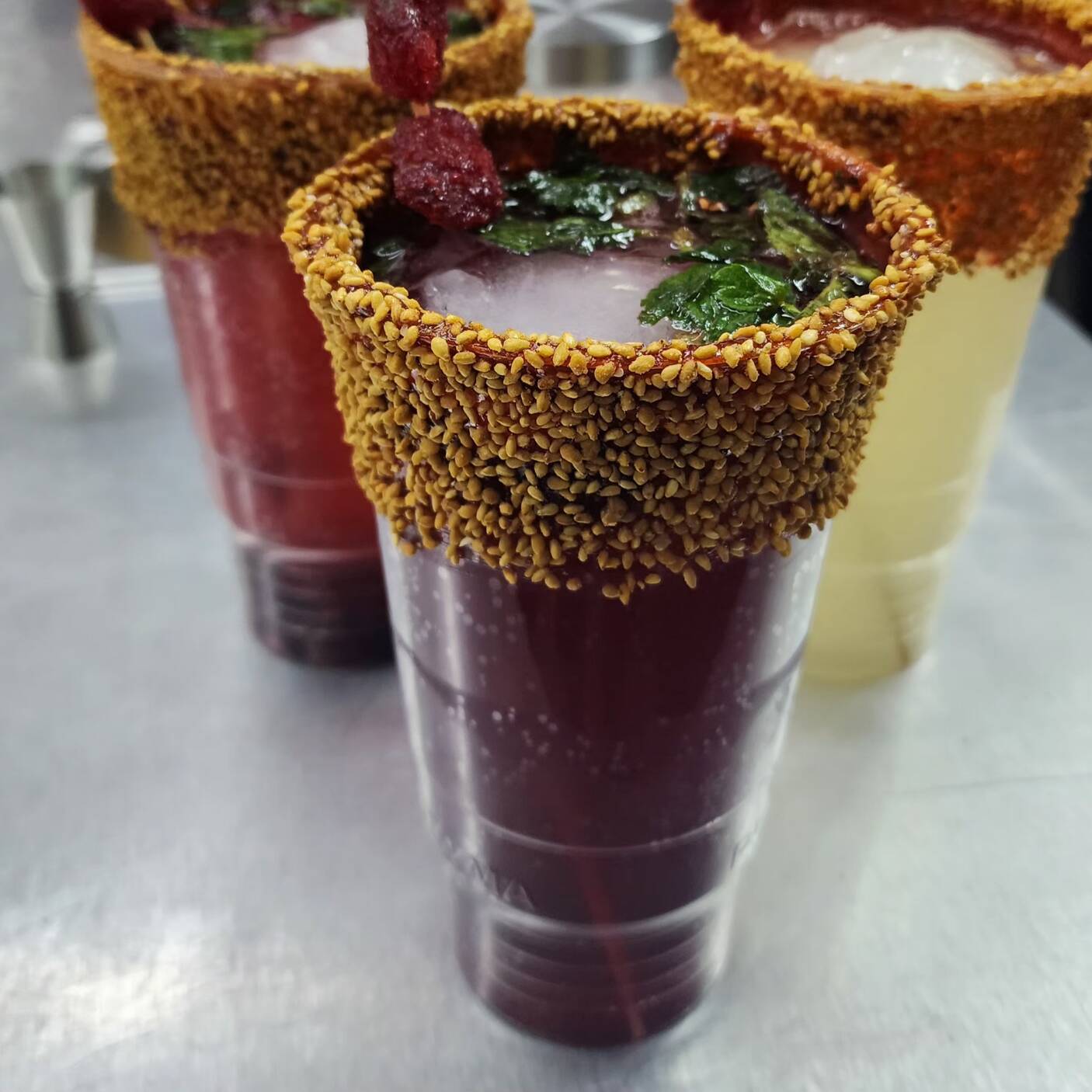 1 skyy de 355 ml, shot de absolut, saborizante de frutos rojos y vaso escarchado a tu gusto
