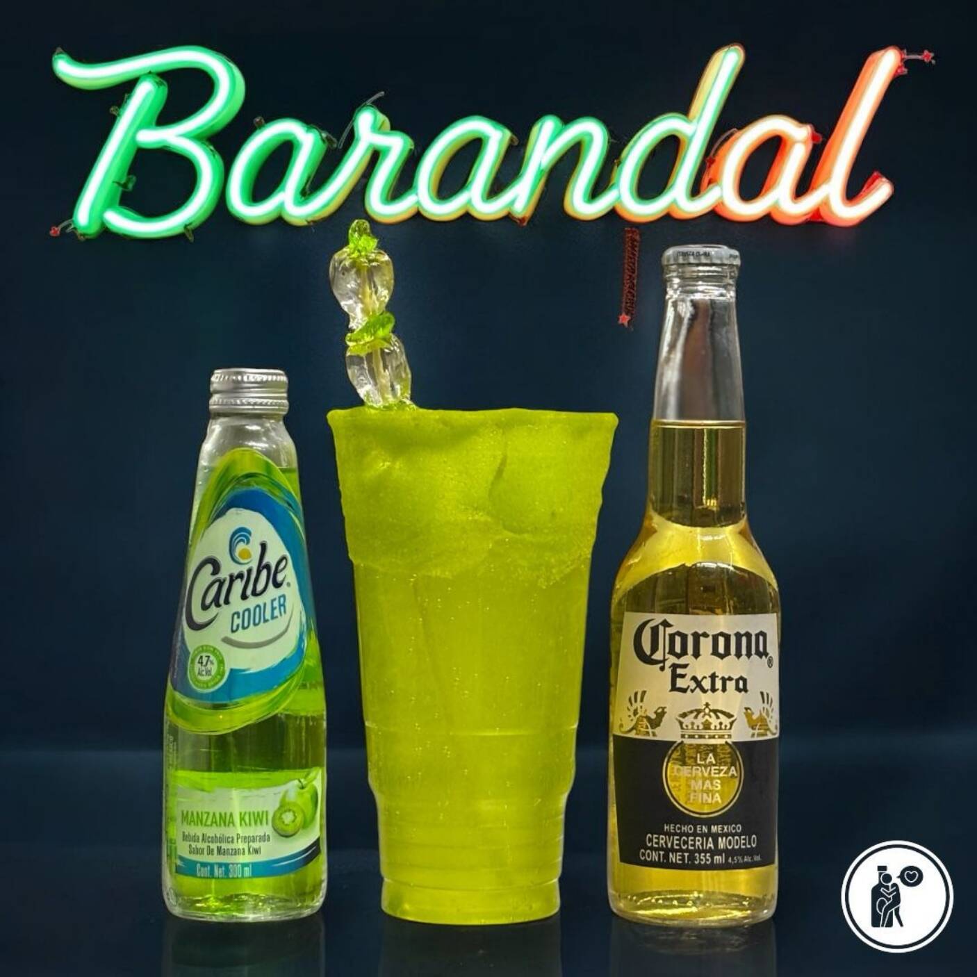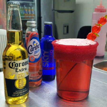 1 cerveza 355 ml, 1 skyy 275 ml, 1 caribe 300 ml, vaso escarchado a tu gusto