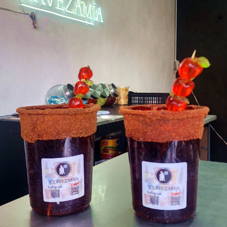 1 cerveza de 355 ml, 1 lata de perla negra 473 ml, vaso escarchado a tu gusto