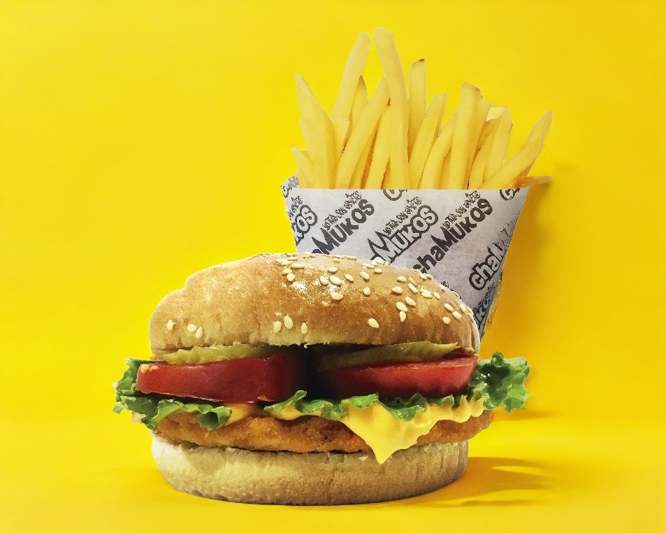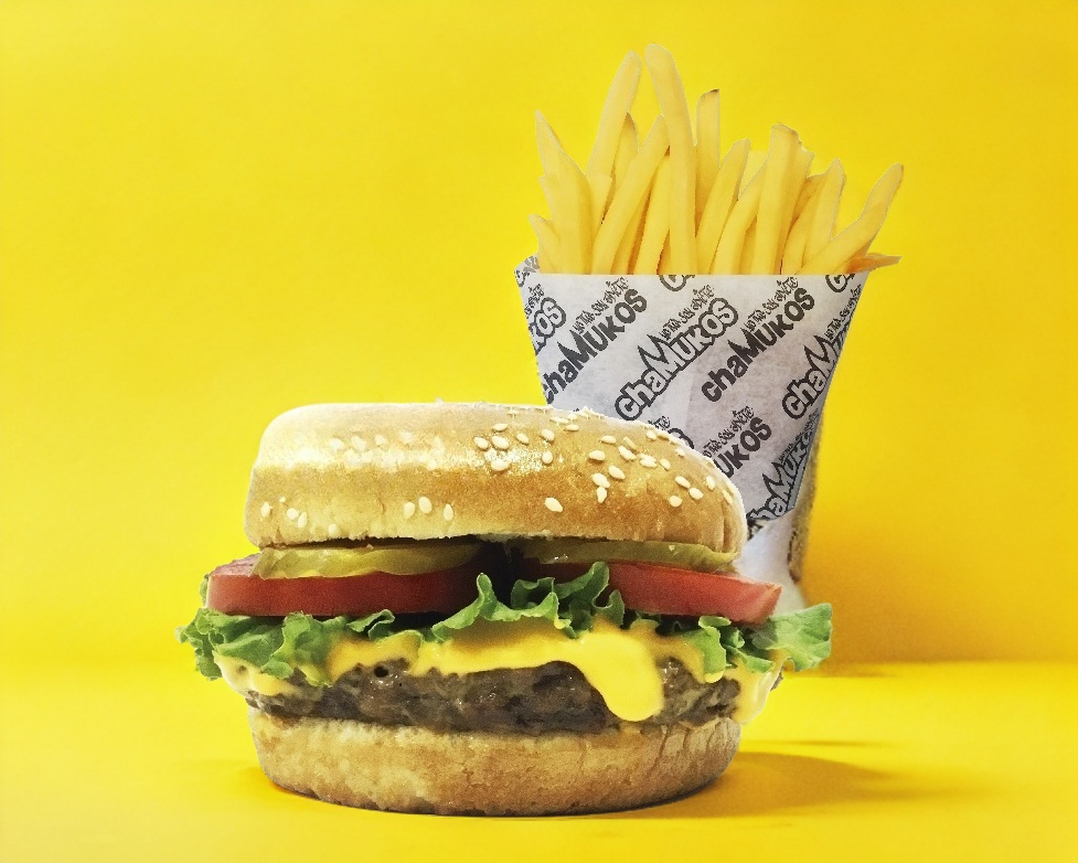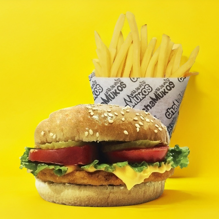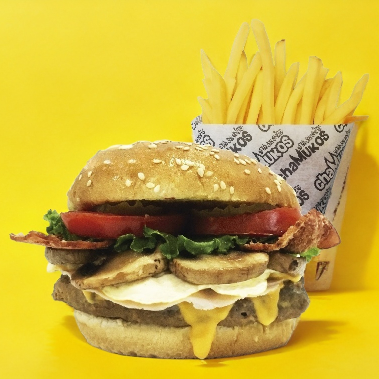 Hamburguesa de Res o Pollo con Queso Oaxaca, Chorizo y Guacamole. Ingdtes. Base: Cebolla asada, Jitomate, Mayonesa y Mostaza. Acompañada de Papas a la Francesa