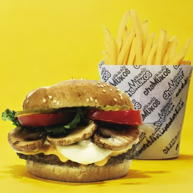 Carne de Res ó Pollo con Queso Cheddar, Queso Oaxaca, Champiñones, Lechuga, Jitomate, Cebolla Asada, Pepinillos y un Side de Papas a la Francesa
