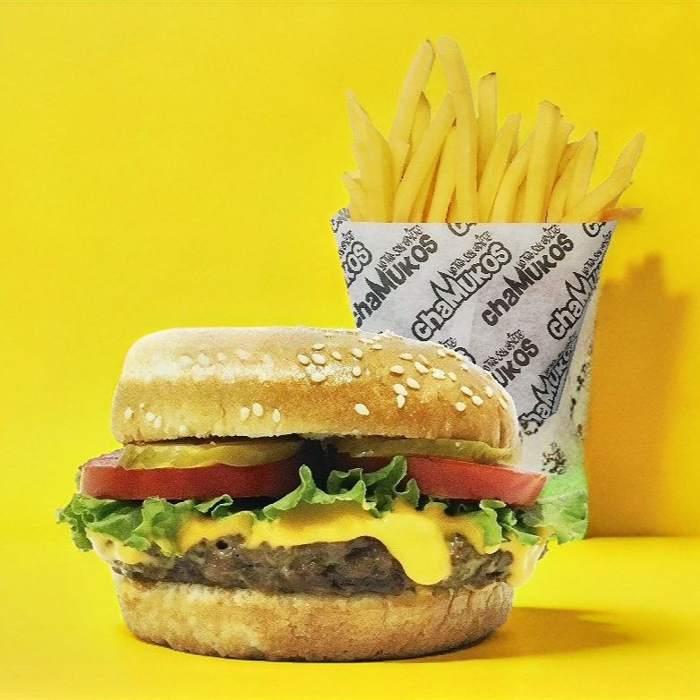 Carne de Res con Queso Cheddar, Lechuga, Jitomate, Cebolla Asada, Pepinillos y un Side de Papas a la Francesa
