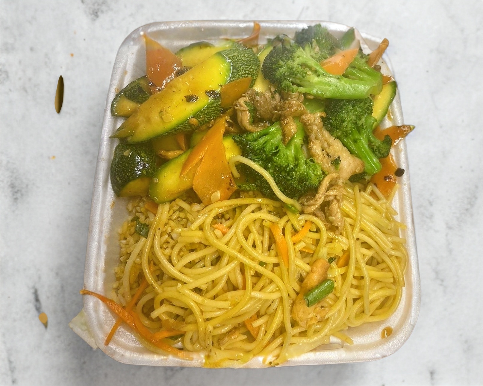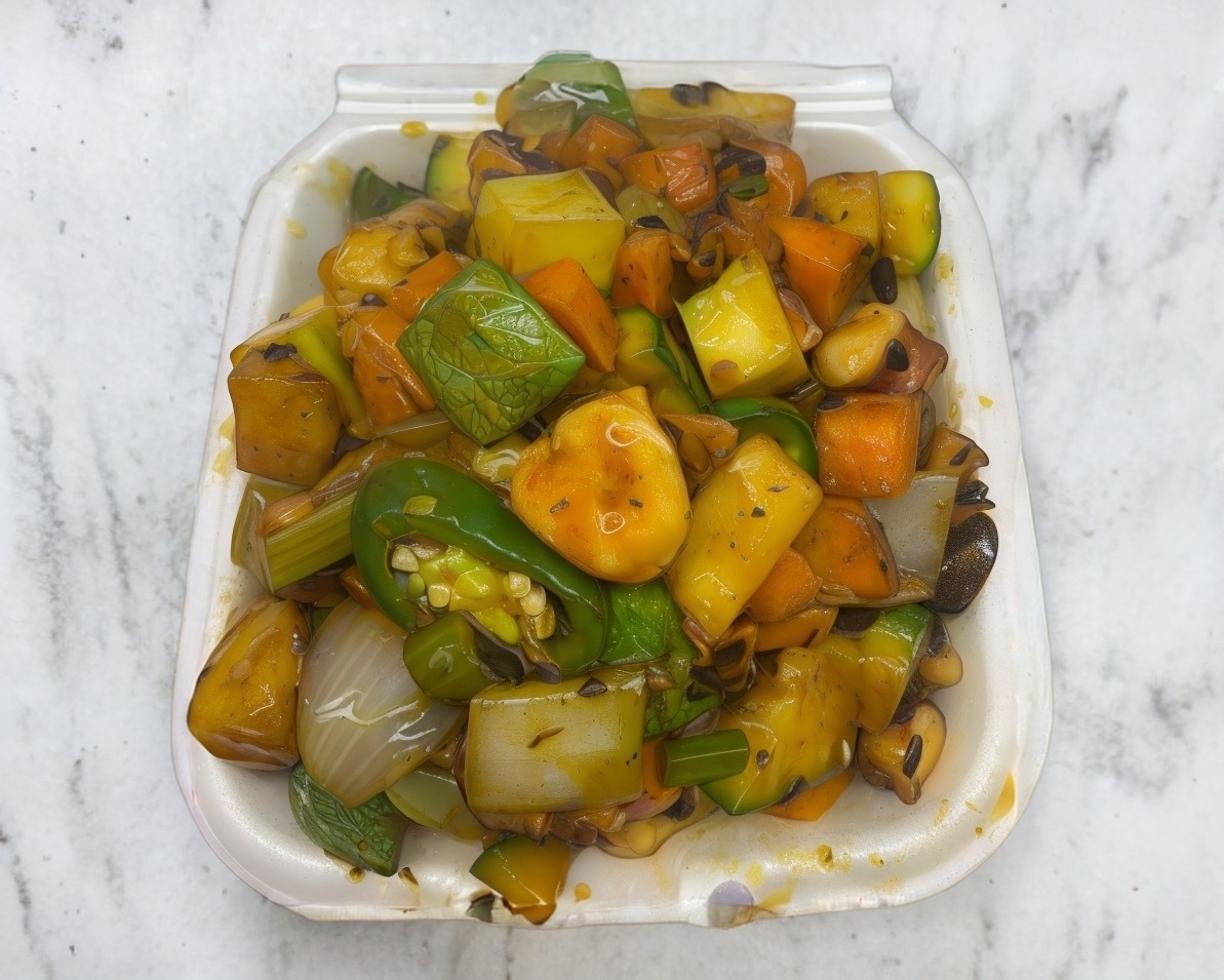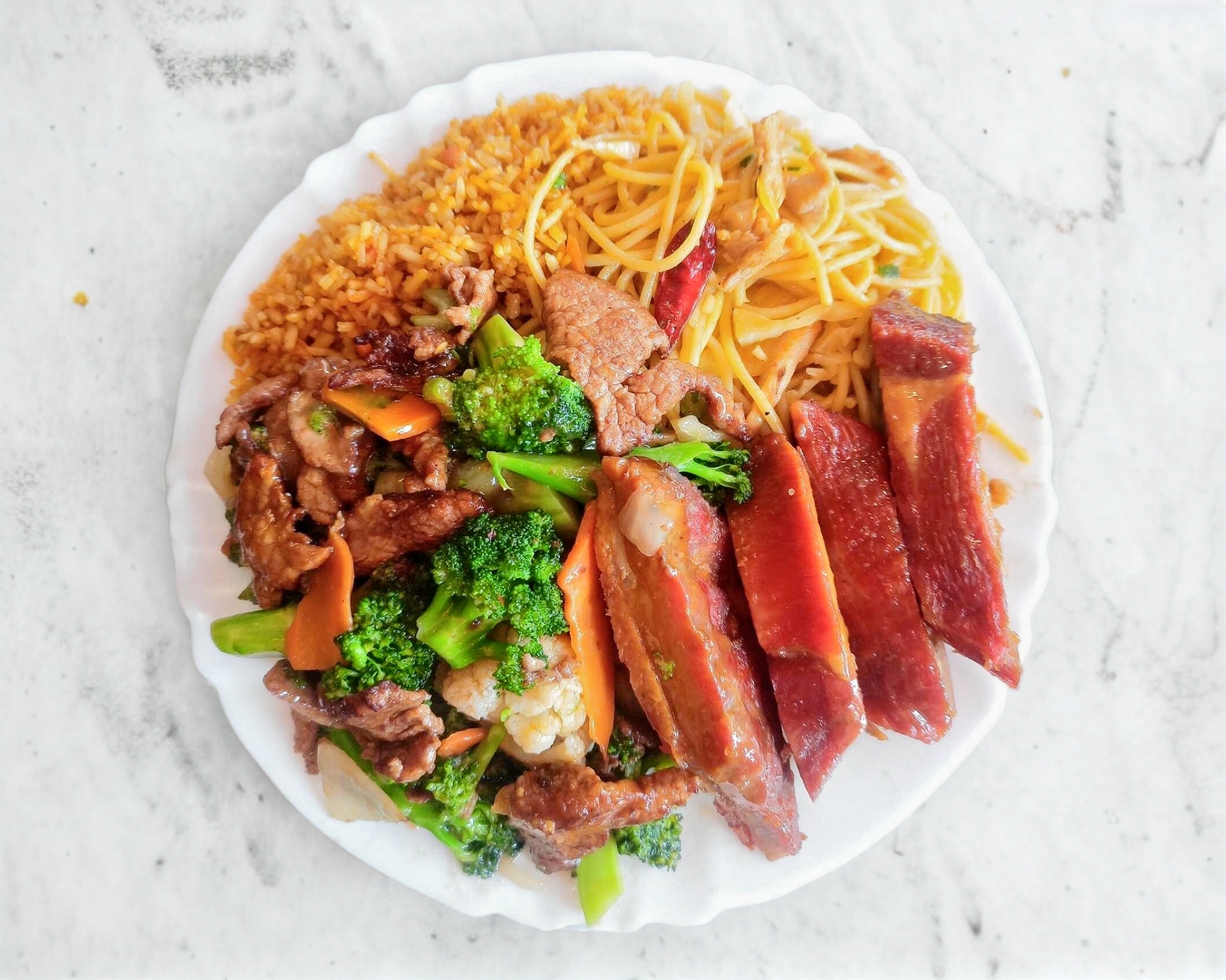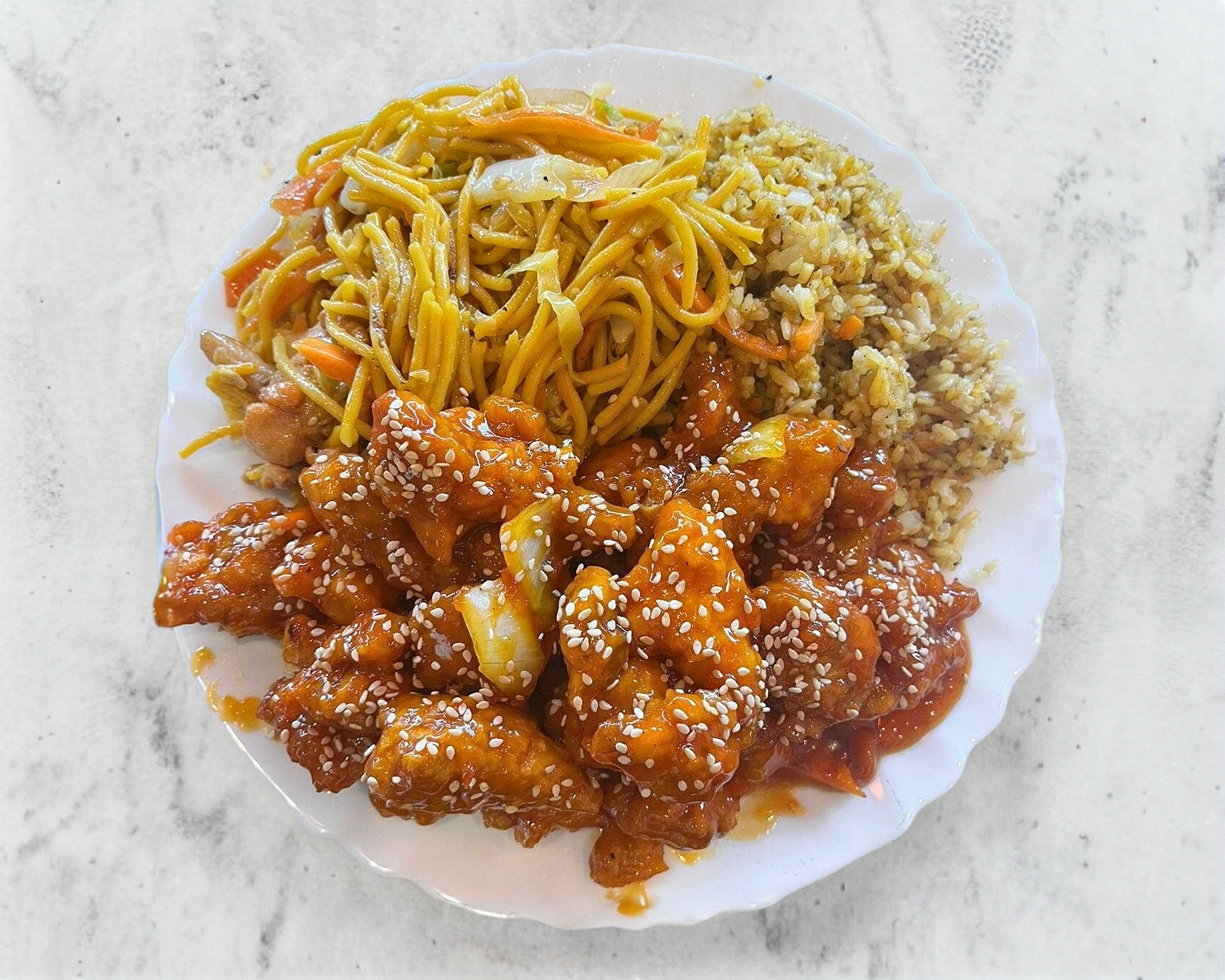 Guarnición con Pollo Agridulce, Brócoli con Res y un Camarón