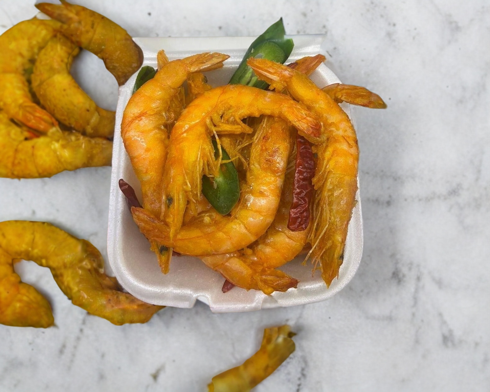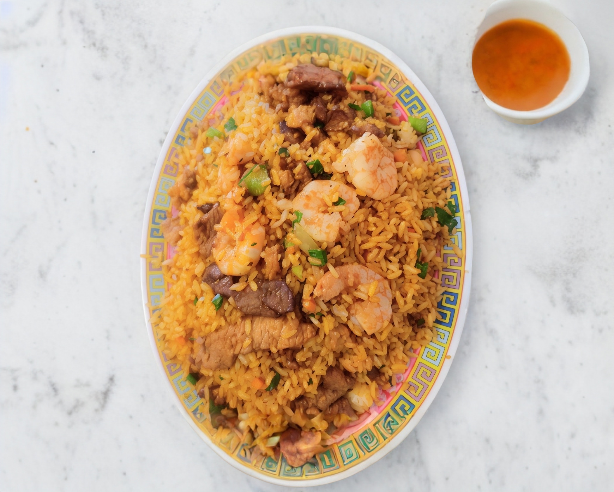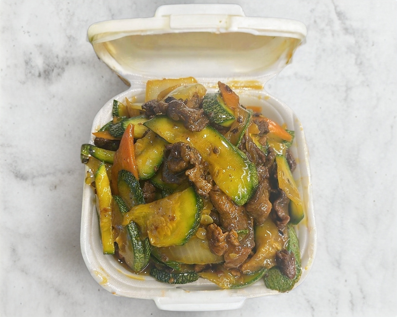 Guarnición con Pollo Agridulce, Brócoli con Res y un Camarón