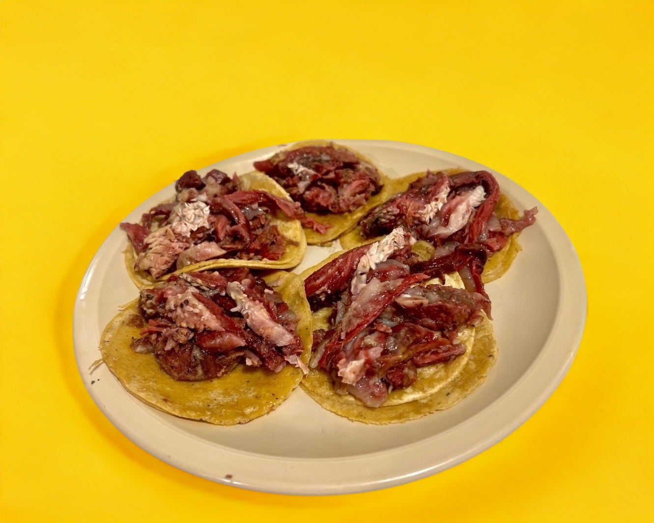 Orden de 5 tacos de sesos en tortilla de maíz. Incluye: verdura, limón y salsas verde y roja enviadas por separado.