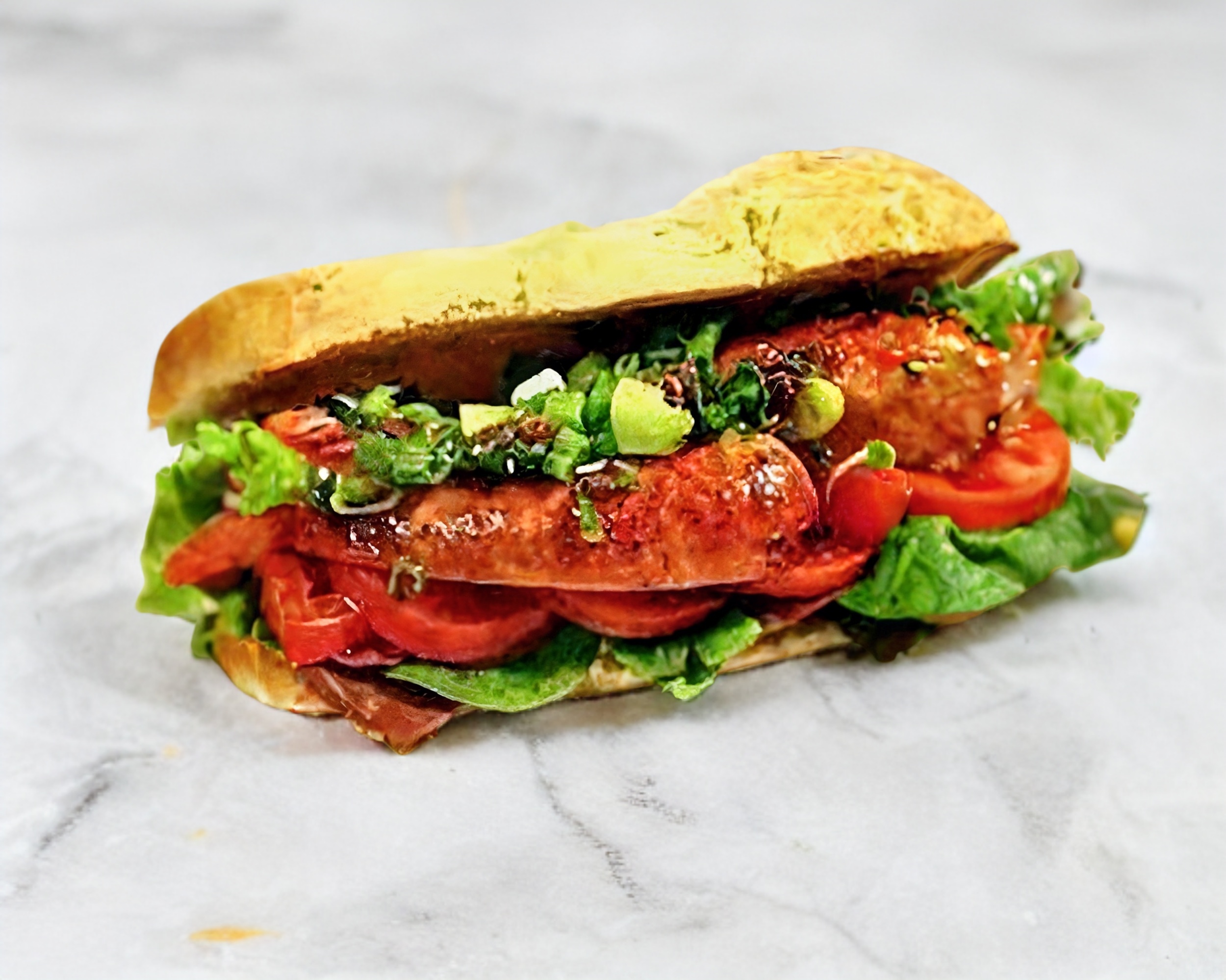 Chorizo argentino, lechuga, jitomate, cebolla y chimichurri en pan.
