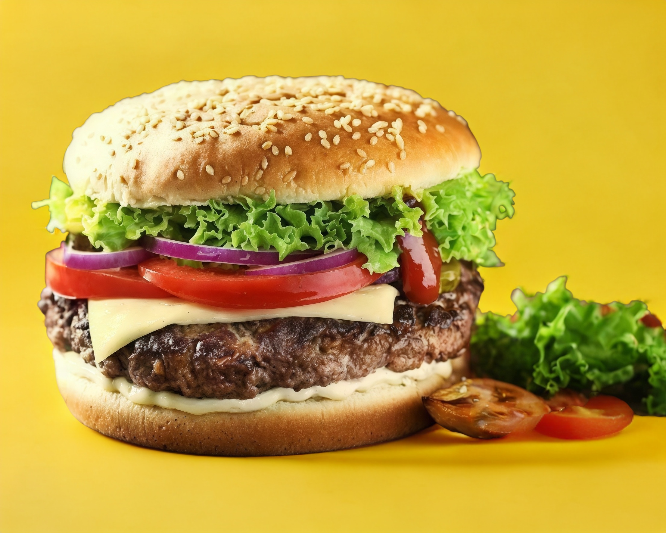 120 gr de carne de res, queso amarillo, lechuga, tomate, cebolla y pepinillos en pan.