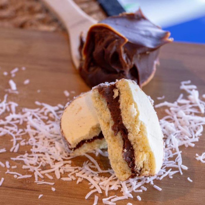 Galleta suave con ralladura de limon y vainilla, rellenas de Dulce de leche y coco rallado