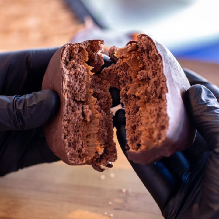 Galleta de cacao organizo suave con dulce de leche y cobertura de chocolate semiamargo