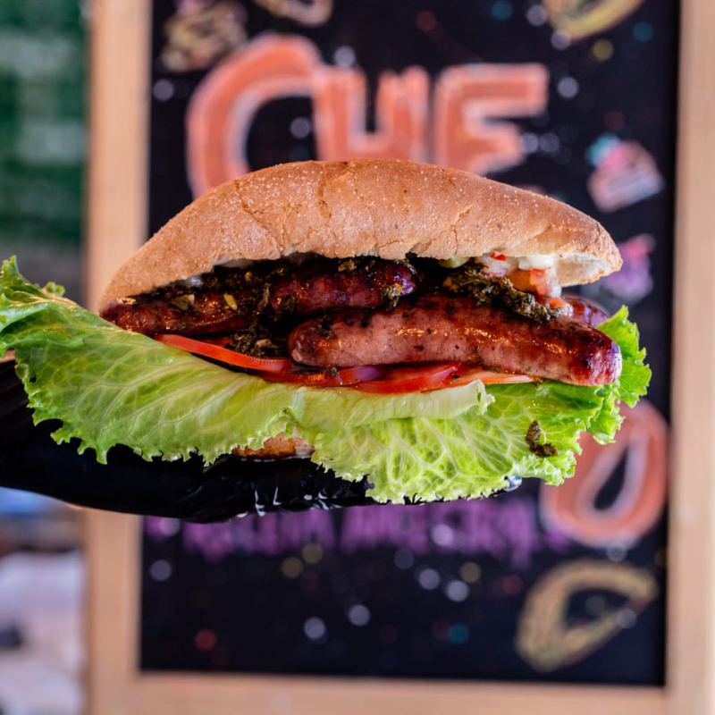 Choripan Argentino gourmet. Pan, Chorizo argentino, mayonesa receta de la casa, lechuga, jitomate, pico de gallo al estilo argentino con aguacate y Chimichurri Receta Original.