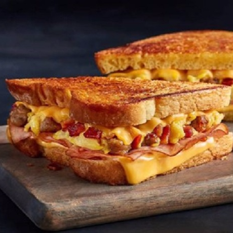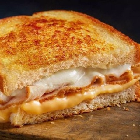 Queso Amarillo, queso Philadelphia, queso manchego y tocino, mayonesa chipotle en pan oroweat