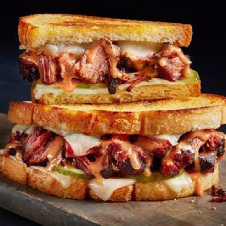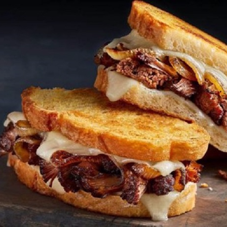 Arrachera con cebolla caramelizada, queso manchego, mayonesa chipotle en pan oroweat