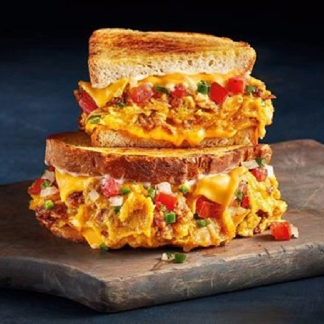 Huevo revuelto, jitomate, chile, cebolla, tocino y queso amarillo, mayonesa chipotle en pan oroweat