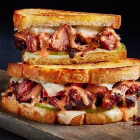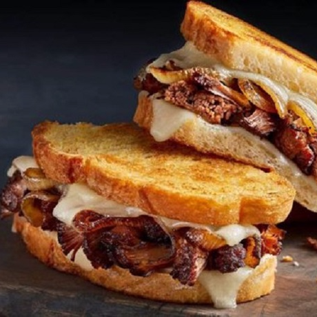Arrachera con cebolla caramelizada, queso manchego, mayonesa chipotle en pan oroweat