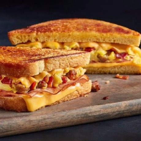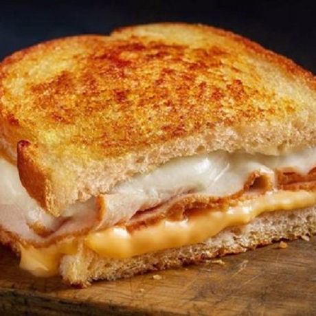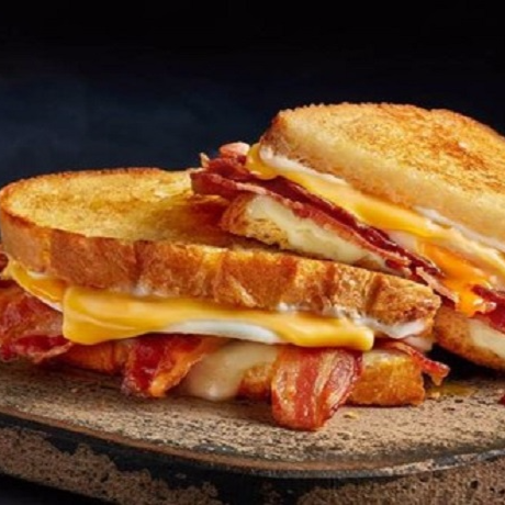 Queso Amarillo, queso Philadelphia, queso manchego y tocino, mayonesa chipotle en pan oroweat