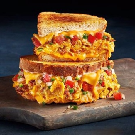 Huevo revuelto, jitomate, chile, cebolla, tocino y queso amarillo, mayonesa chipotle en pan oroweat