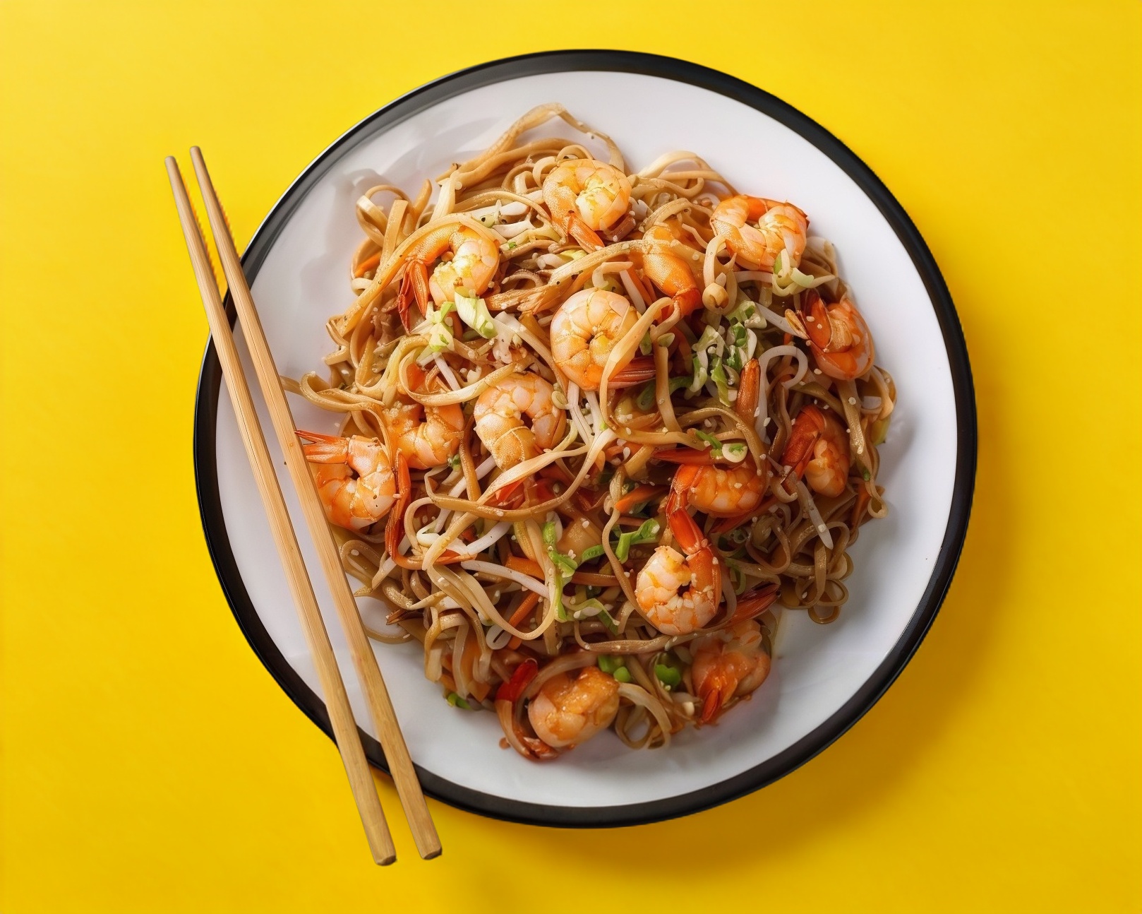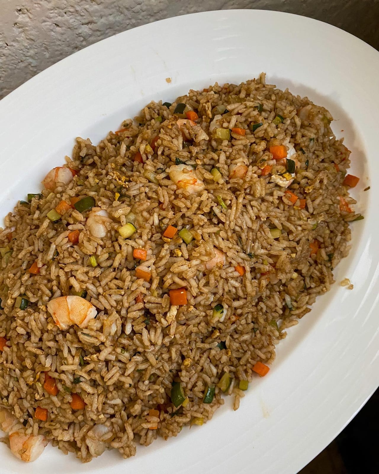Arroz frito con pollo, camarones y salsa soya.
