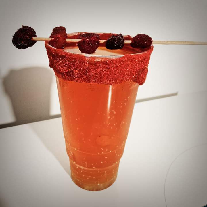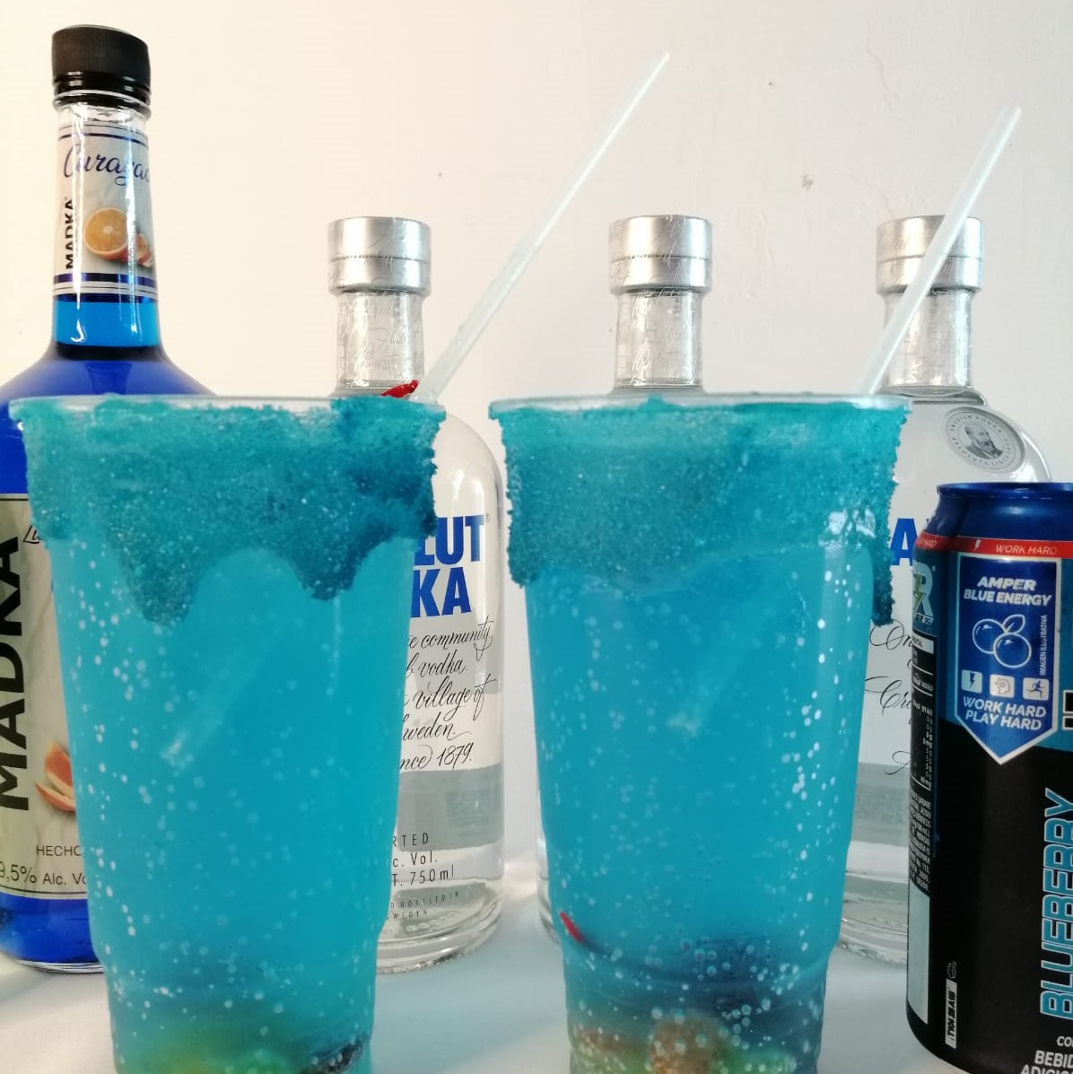 4 Oz Vodka, licor azul curazao, refresco de limon, amper blue, cerezas y gomitas, escarchado azul y miguelito
