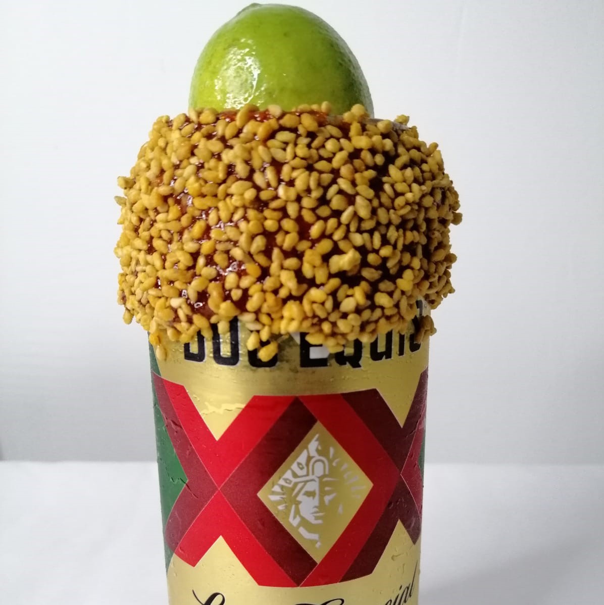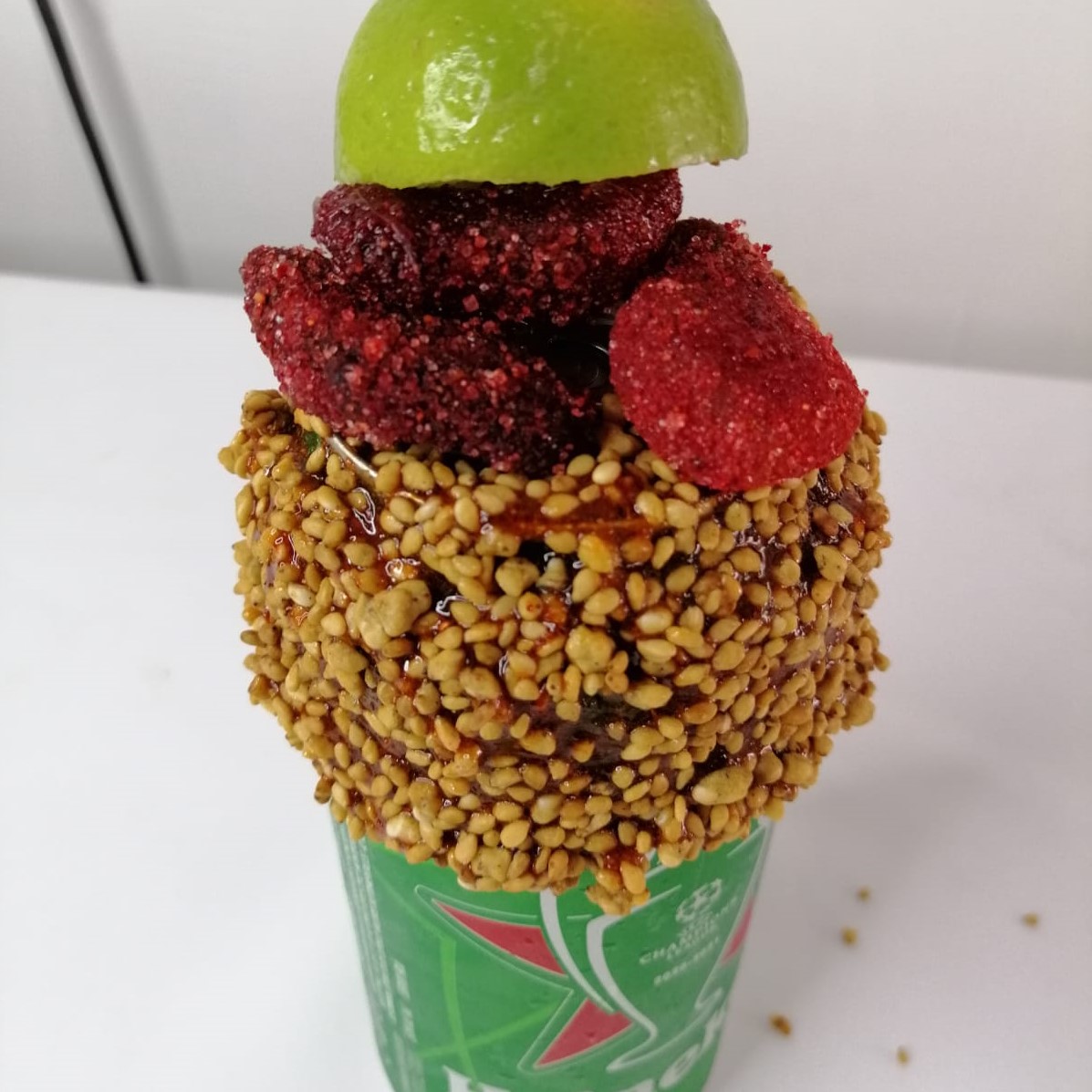 Lata escarchada de tamarindo y ajonjoli garapiñado con 4 gomitas de chile (Todos los latones son de 473ml, excepto las que especifican 355ml)