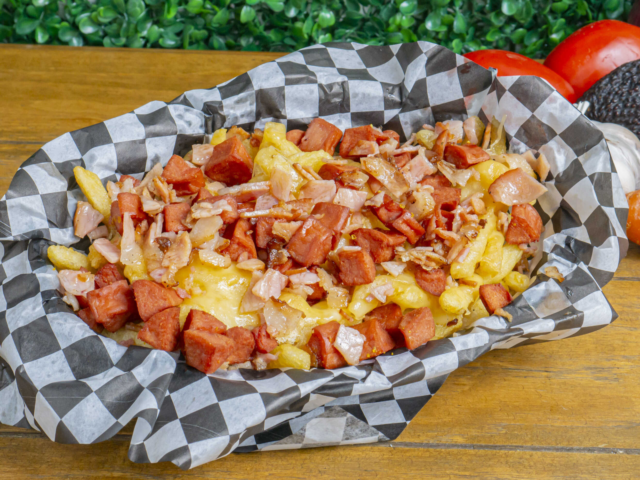 Queso cheedar, tocino y salchicha