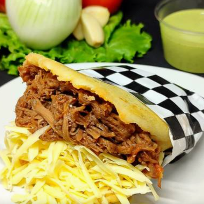 Arepa asada hecha con harina de maiz sin gluten, rellena de carne mechada de res y queso manchego.