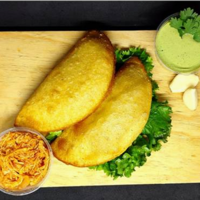Empanada frita hecha con harina de maiz sin gluten, con el caracteristico sabor de la costa venezolana, rellena de pollo deshebrado.