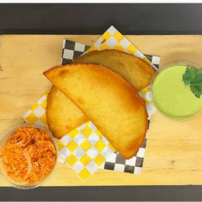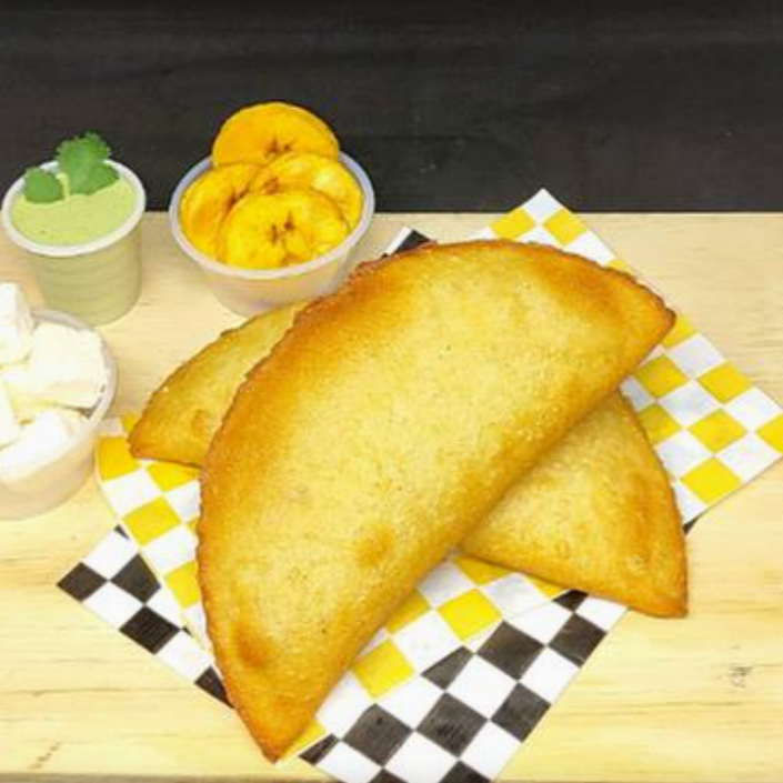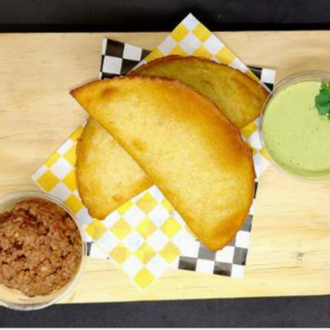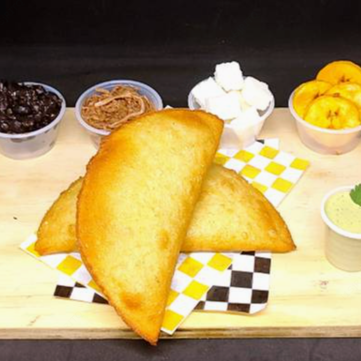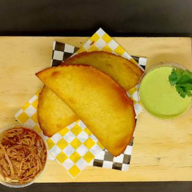 Empanada frita hecha con harina de maiz sin gluten, rellena de carne deshebrada, platano macho frito, frijoles negros y queso cotija.
