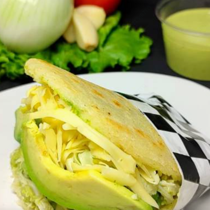 Arepa asada hecha con harina de maiz sin gluten, rellena con pollo deshebrado, aguacate, sal y un toque de mayonesa.