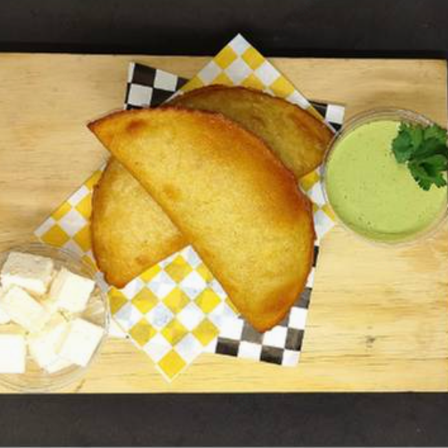 Empanada frita hecha con harina de maiz sin gluten, con el caracteristico sabor de la costa venezolana, rellena con queso cotija.
