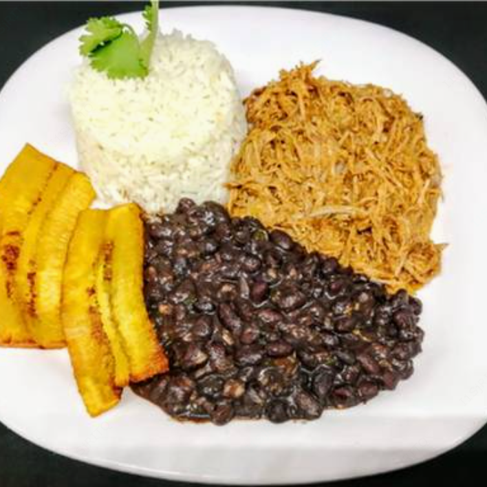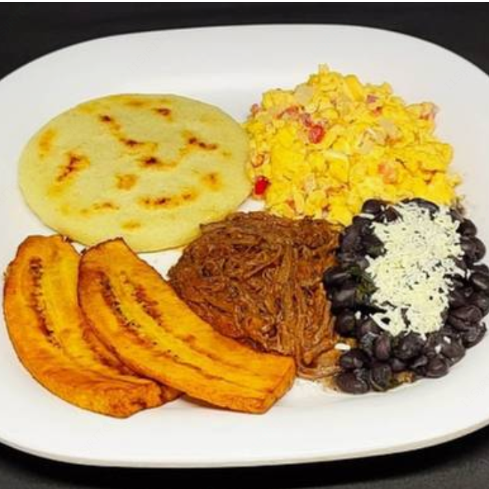 Plato típico venezolano, contiene carne deshebrada de Res, frijoles negros enteros, arroz y platano macho frito.
