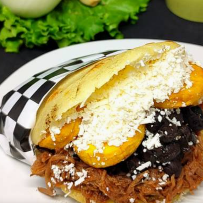 Arepa asada hecha con harina de maiz sin gluten, rellena de carne deshebrada de res, platano macho frito, frijoles negros y queso cotija.