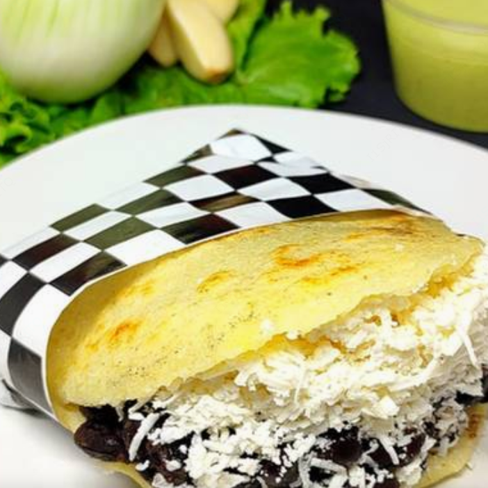 Arepa asada hecha con harina de maiz sin gluten, rellena con frijoles negros y queso cotija.