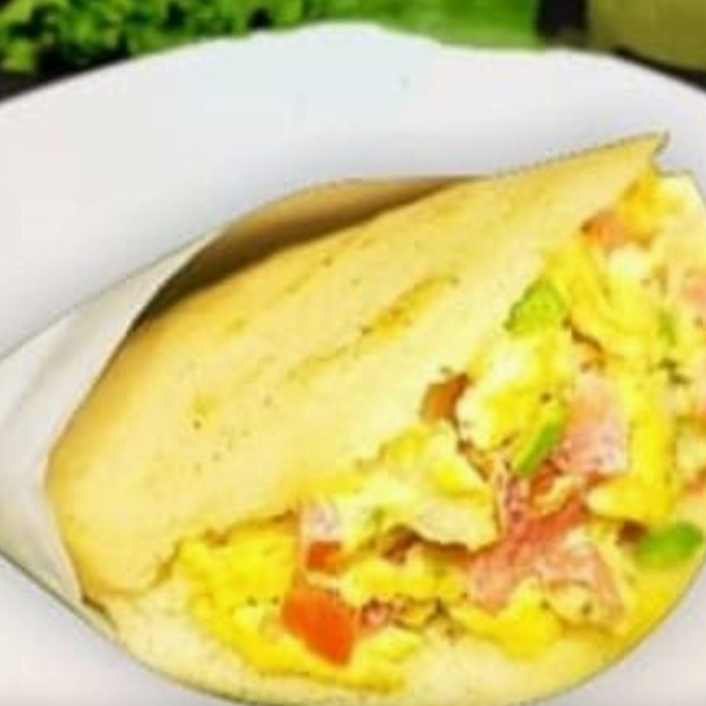 Arepa asada hecha con harina de maiz sin gluten, rellena de huevos revueltos , contiene jitomate, y cebolla.