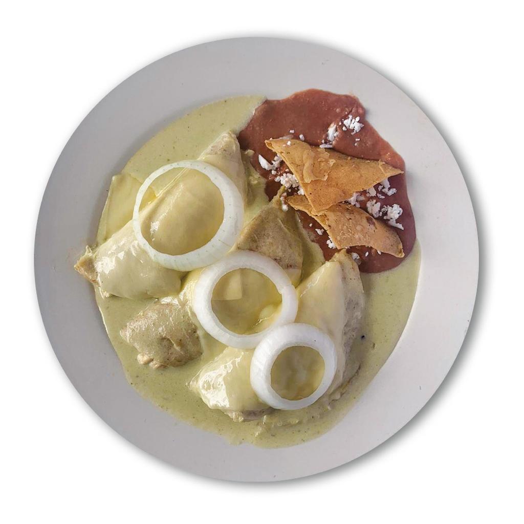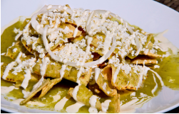 Deliciosas enchiladas de pollo, preparadas con salsa de la casa. Acompañadas de crema y queso panela.