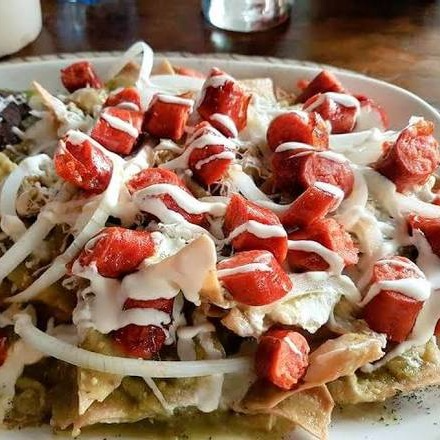 Nueva especialidad de la casa . Deliciosos chilaquiles verdes o rojos , acompañados de lo tradicional (crema Alpura y Queso panela) pero complementado con Chorizo Argentino y chistorra .