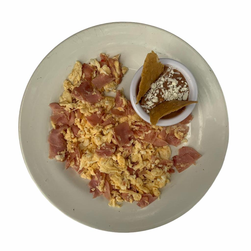 2 ricos huevos con jamón de pavo acompañados de frijoles refritos.