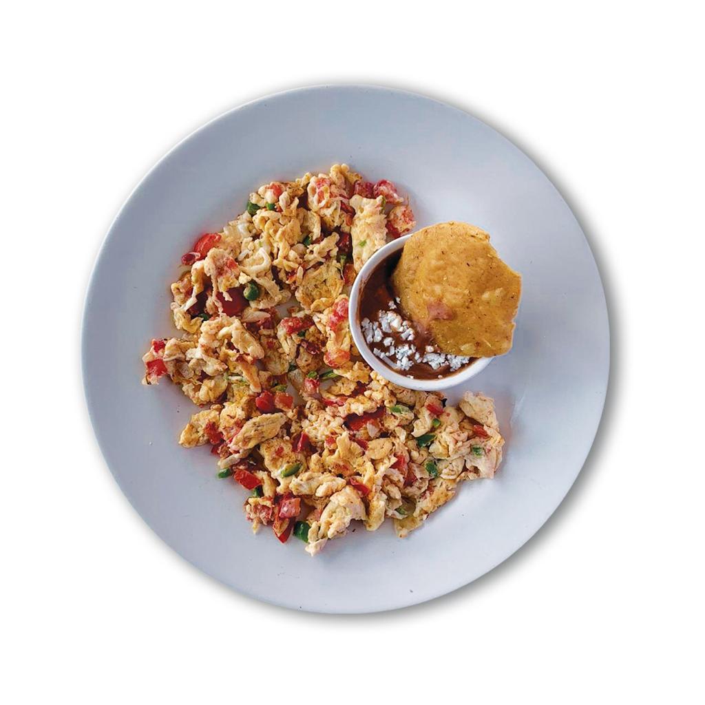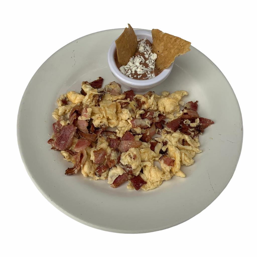 2 ricos huevos revueltos acompañados de frijoles refritos.