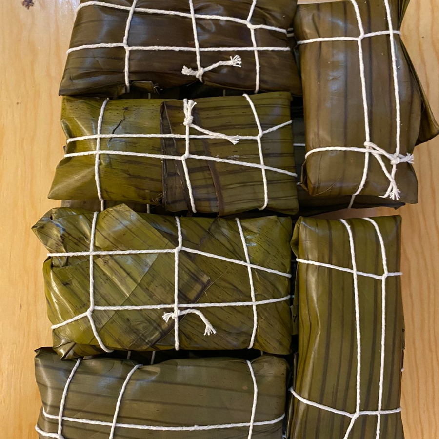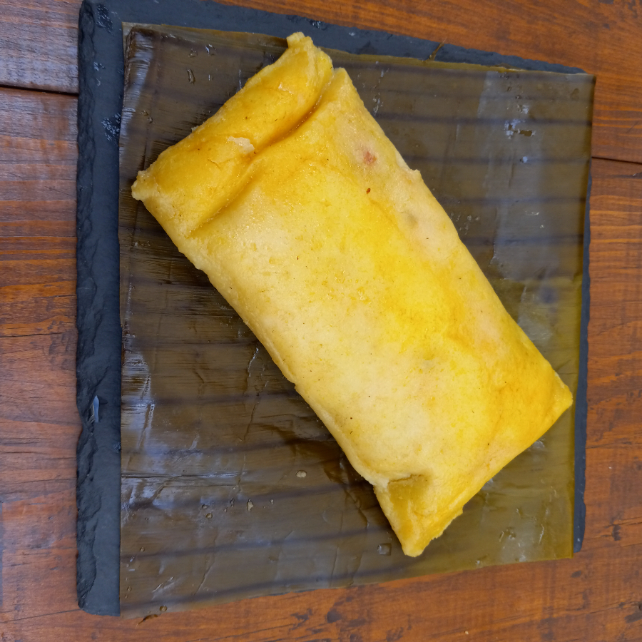 Tamal de masa de maiz relleno de pollo, res y cerdo, aceituna, pasa y garbanzo estilo andina. Peso 300g