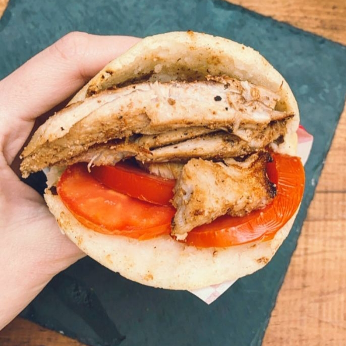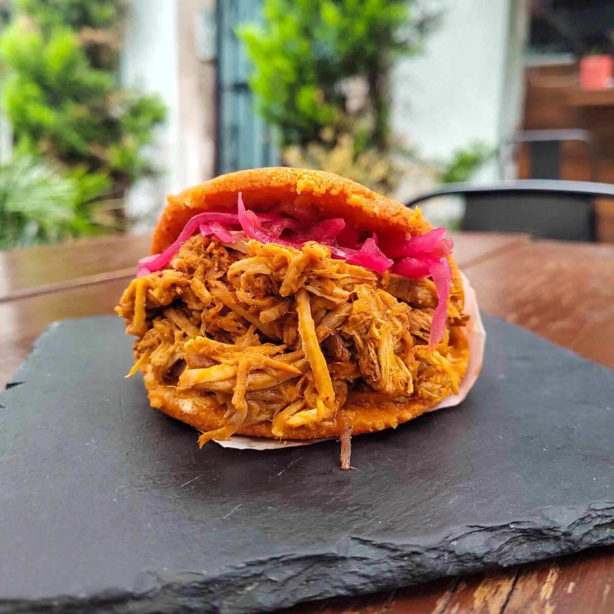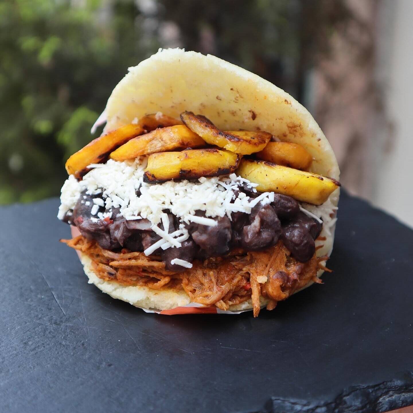 Arepa rellena de carne deshebrada, frijol, negro, tajadas de platano macho y queso cotija