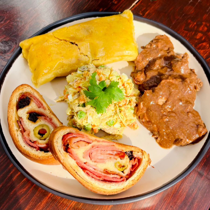 Pan relleno de jamón ahumado, lomo ahumado, tocino, aceituna y pasas. 2rebanadas calientes