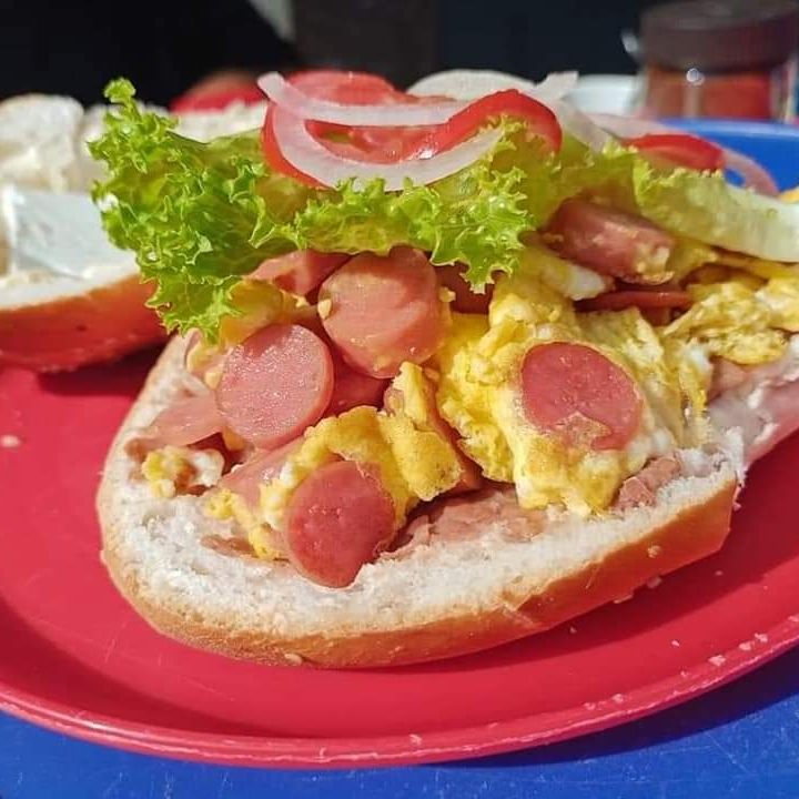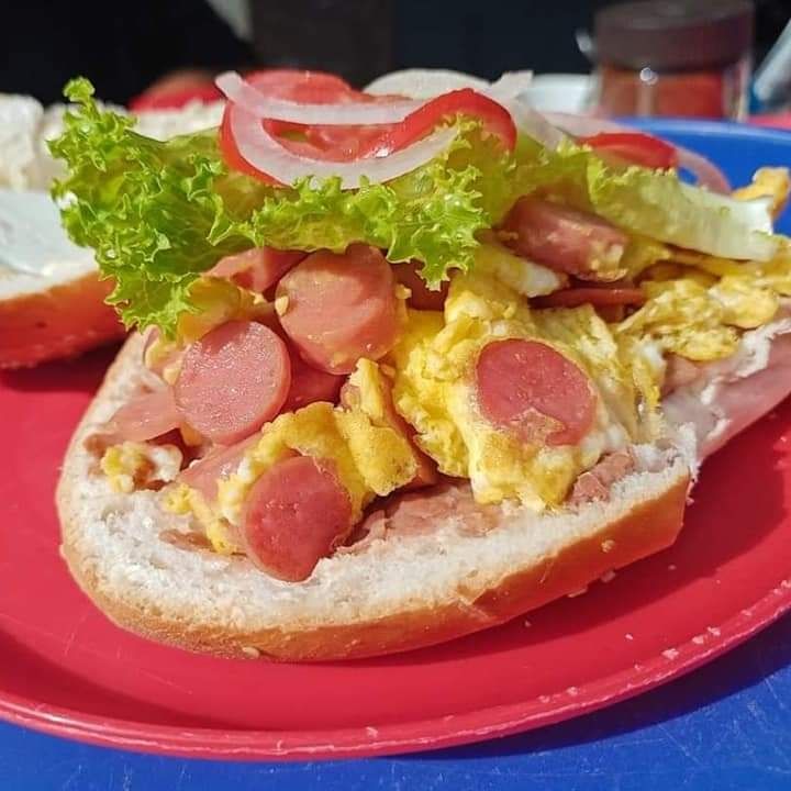 Pan blanco, frijoles, mayonesa, queso blanco, salchichas , verduras y picante al gusto.