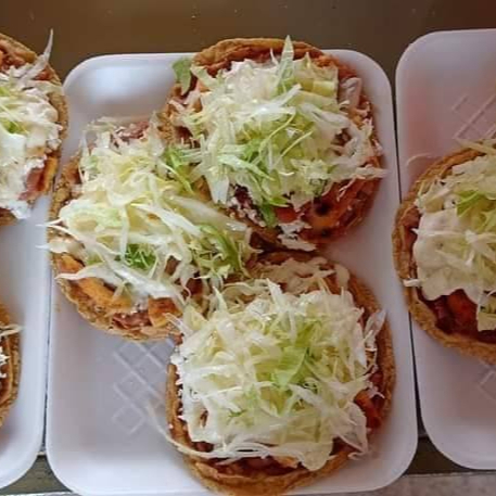 Masa de maíz con una capa de frijoles refritos, queso blanco rallado, crema, lechuga y salsa al gusto.