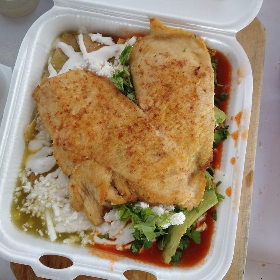 Tortillas doradas con pollo deshebrado, bañados en salsa verde o roja con crema, queso y cebolla al gusto.